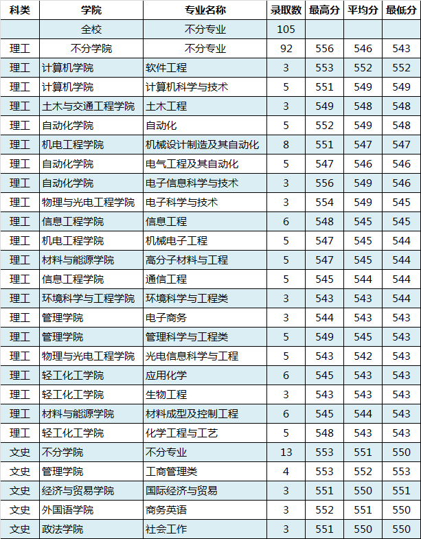 广东工业大学2017年高考在广西各专业录取分数线情况