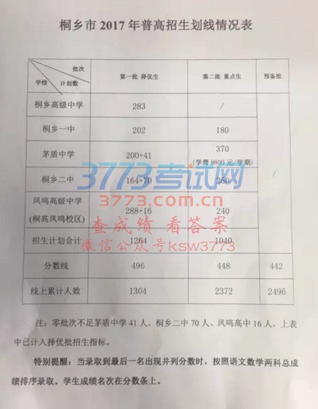 桐乡教育局消息:2017年桐乡中考第一批择优生录取分数线为496分,线上人数为1304人,招生名额为1264人。其中桐高283人,桐乡一中202人,茅盾中学200+41人,凤鸣高级中学288+16人,桐乡二中164+70人。(其中保送生不足茅盾中学41人,桐乡二中70人,凤鸣高中16人,已计入择优批招生指标)。第二批重点生录取分数线为448分,线上人数2372人,招生名额为1040人。其中桐乡一中计划招生180人,茅盾中学370人,凤鸣高级中学240人,桐乡二中250人。预备批分数线为442分,上线人数为2496人。