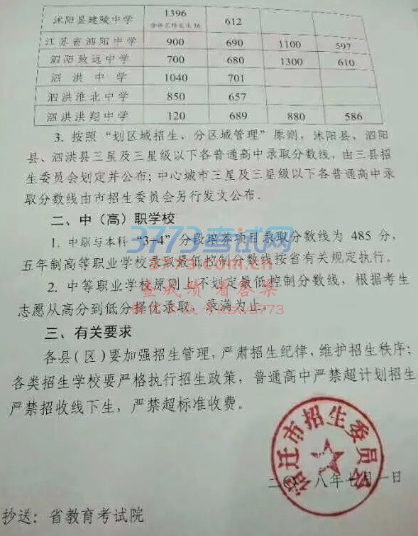 2018年宿迁中考招生录取分数线 全市中考情况:45528人考试,沭阳14262人。最高757分。普高计划29174人,沭阳9882人。最低控制线:普高450,四星级:沭中675,如东672,建陵中学612。