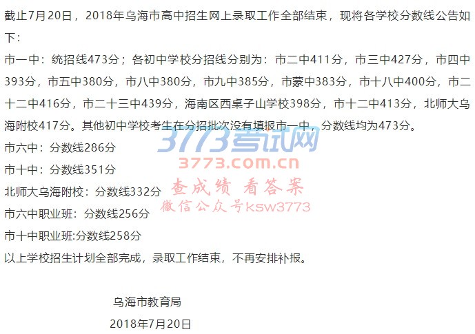 截止7月20日,2018年乌海市高中招生网上录取工作全部结束,现将各学校分数线公告如下: