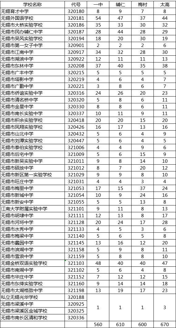 无锡一中、辅仁高中、梅村高中和太湖高中除自主招生和统招计划外,其余招生指标全部分配到相关初中学校。
