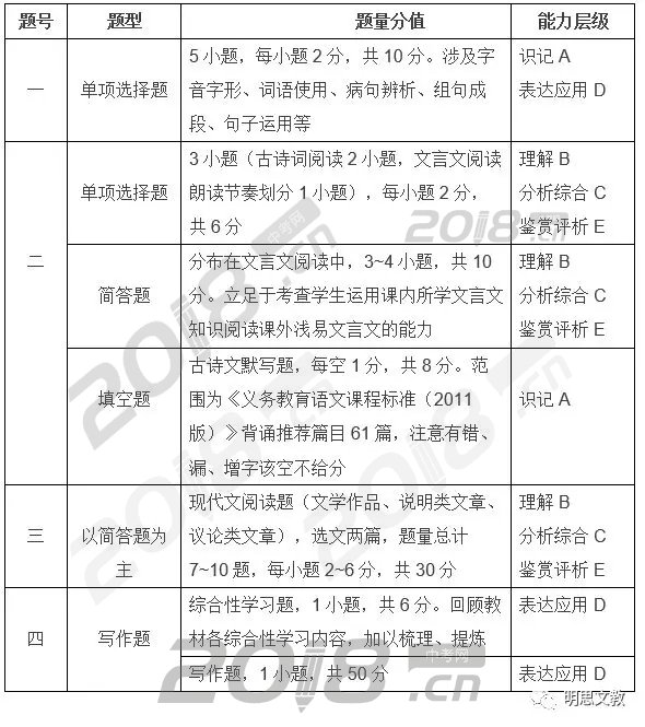 2018年江西省语文中考在考试形式、试卷结构上与2017年一致,由语言知识及其运用、古诗文阅读与积累、现代文阅读、综合性学习与写作四大部分组成。试题重视阅读材料的选择、教材资源的利用、本土文化资源的利用,体现出文化味、和谐感和创新性。