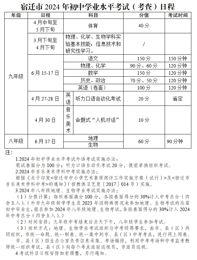 宿迁市教育局印发《宿迁市2024年初中学业水平考试方案》