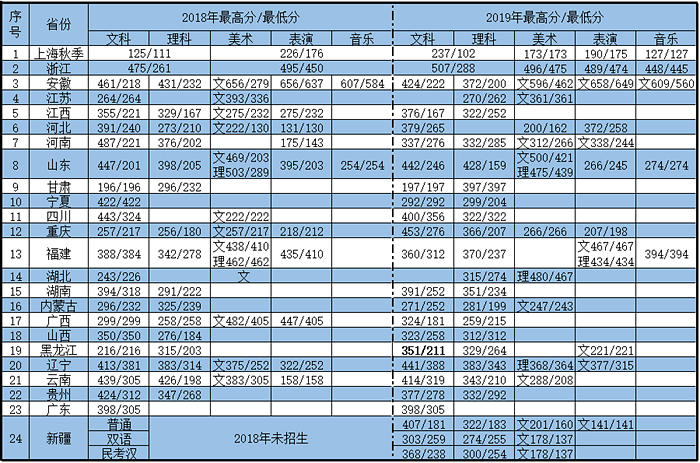 2018-2019年邦德学院秋季高考各省市招生最低录取分数线